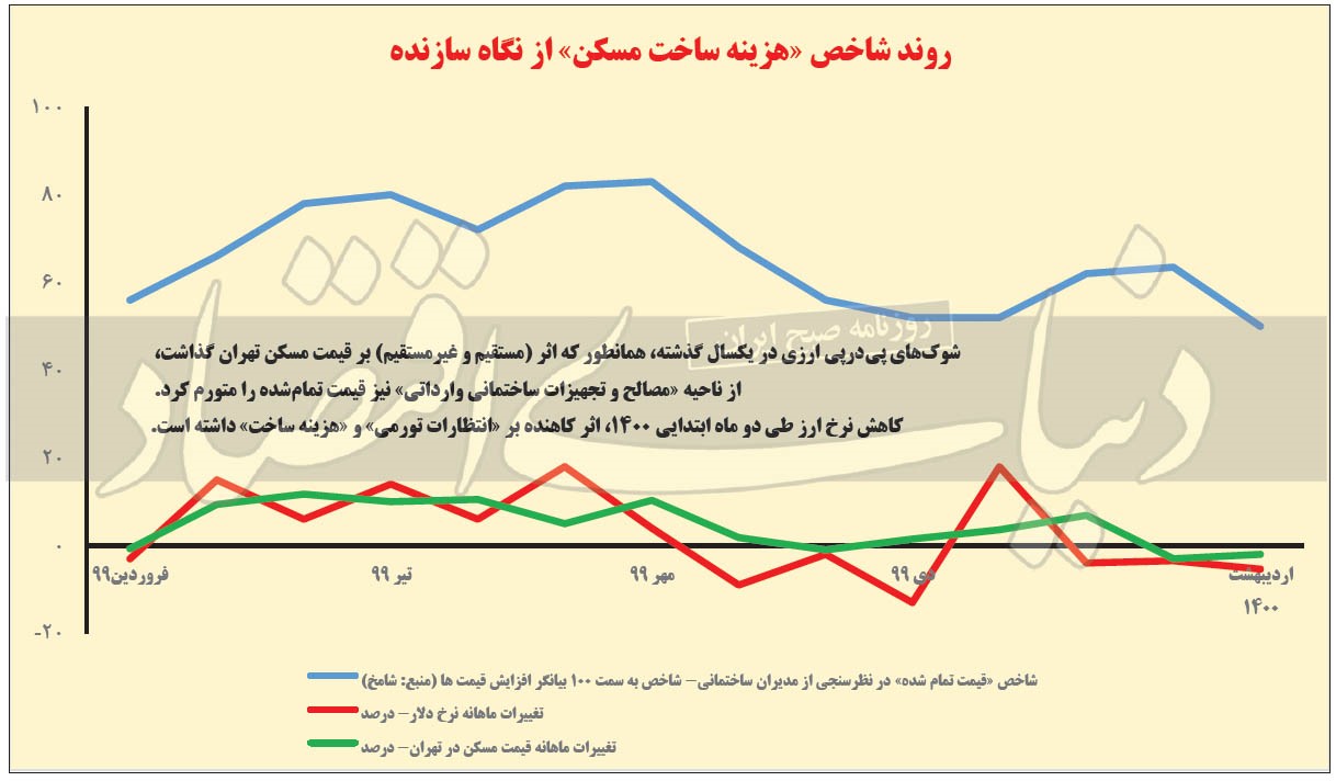 در وضعیتی که متوسط قیمت مسکن در شهر تهران در دو ماه فروردین و اردیبهشت 1400 در قیاس با اسفند 1399 برابر با 5 درصد افت داشته و بازار دادوستدهای مسکن در این دو ماه تورم منفی را به خود می دید، بخشی از فعالان مسکن تورم مثبت بخش ساخت و ساز را به عنوان سد اصلی در راه کاهش نرخ و تداوم ریزش ارزش واحدهای مسکونی معرفی می کنند.
